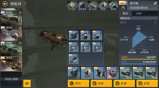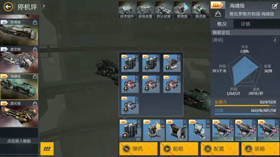 游戏提供5个系列,6个等级,共计258枚舰船的超庞大舰船科技树,供玩家在游戏中研修,并根据自身资源情况进行攀登。通过定制组合上千种类型不同的武器、装置、组件和弹药,甚至生产出泰坦级的超级旗舰。