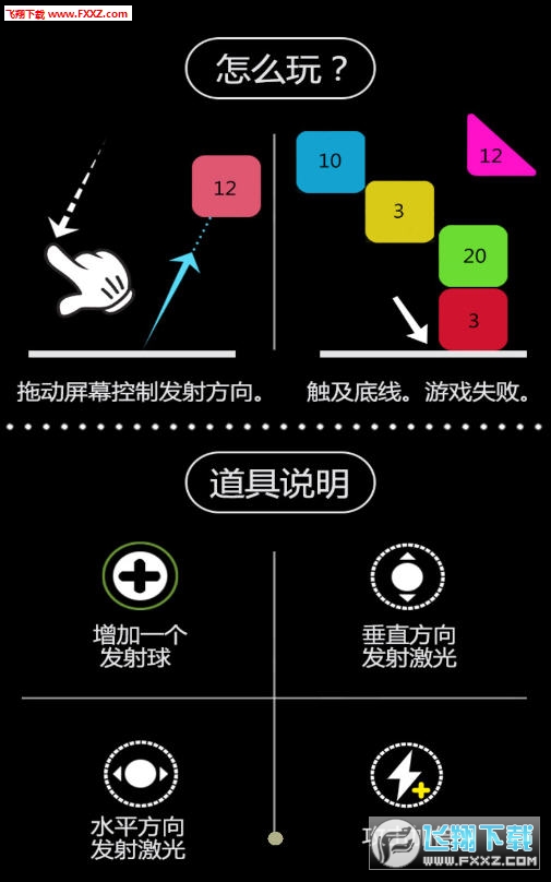 虽然炮台的子弹能打倒砖块,但是砖块可是源源不断出现的,你需要调整好炮台发射的方向,使打到砖块后弹射的子弹尽可能的弹到更多的砖块上,就像电视剧里的弹跳弹,超炫的有木有!除了调整弹射角度,游戏中还有很多实用道具,用子弹打掉道具就能获得特殊能力哦,都是让你打倒砖块的神器,利用好的话不仅能保命,还能快速清场,让你坚持的更久!