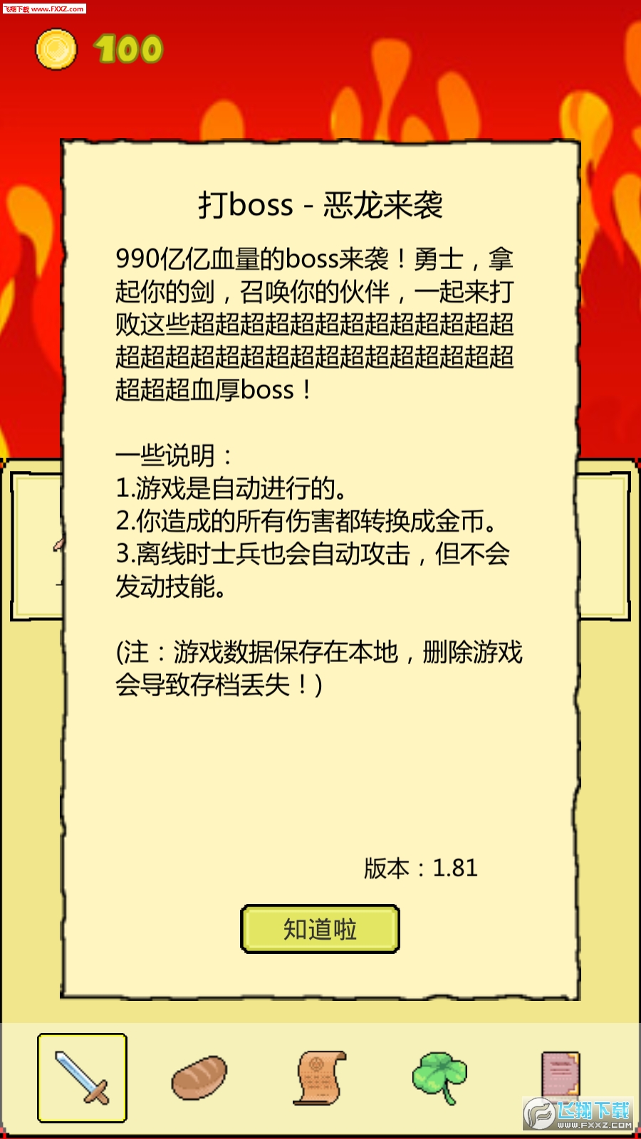 Fight With Boss手游是一款相当刺激趣味的手机战斗冒险游戏。进入游戏世界后我们就将拿起手中武器和装备进行一场激烈的文字战斗体验。游戏玩法简单休闲,超高的伤害和奇葩的游戏体验都让人爱不释手,喜欢本作的话那就速速下载参加战斗吧。