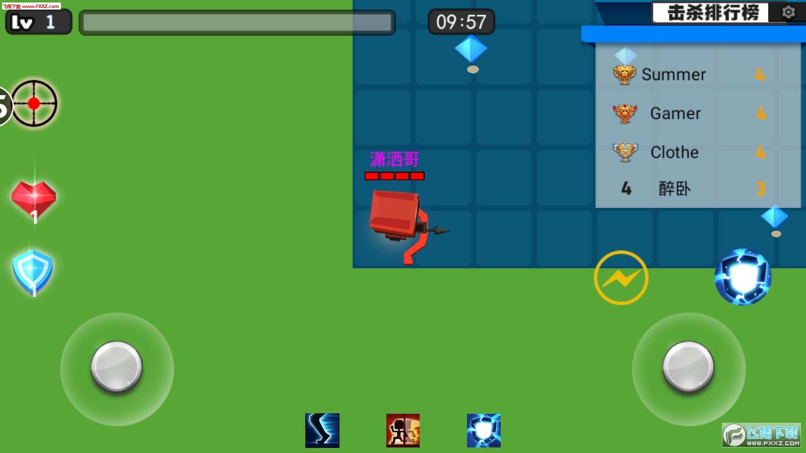 1.通过虚拟摇杆控制走位,利用手中的弓箭击败对手;