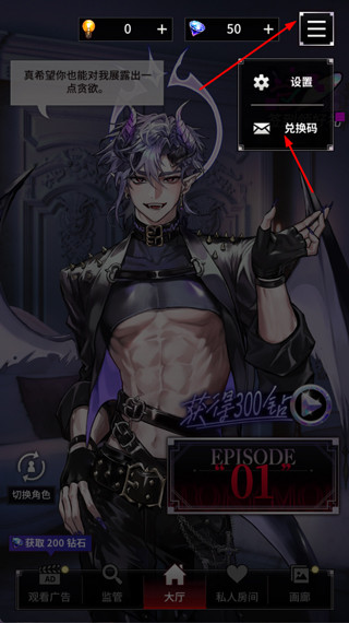 1、打开游戏,点击右上角菜单按钮,选择兑换码;