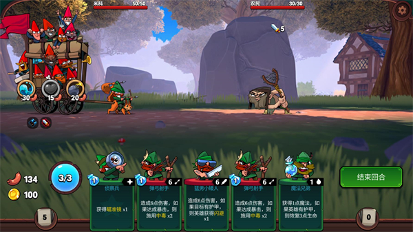 5、进入战斗后玩家需要使用不同的小矮人卡牌击败对手,每个卡牌都会消耗1点魔法,最多有3点魔法可以使用。