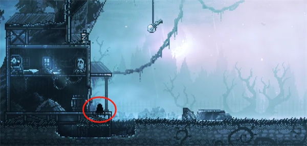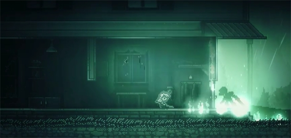 3、流浪者视角。往左走到房子前松动的木板上,站在木板上跳几次,破坏木板,从木板下的坑道爬进房子,获得镰刀。然后推开房门出去,砸死门外的黑色怪物。