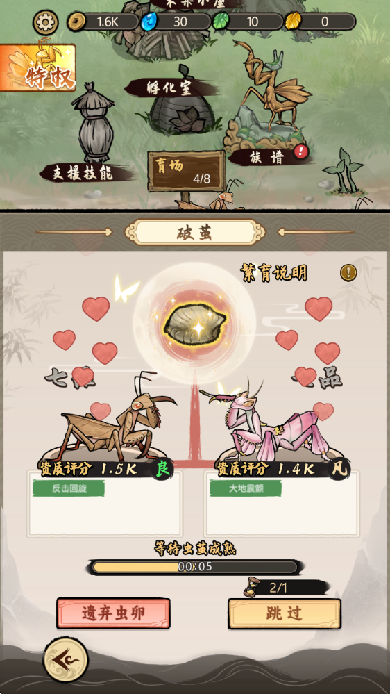 3、繁育系统:通过交配组合不同属性的螳螂,有机会诞生出拥有更高品质和技能的新品种后代。