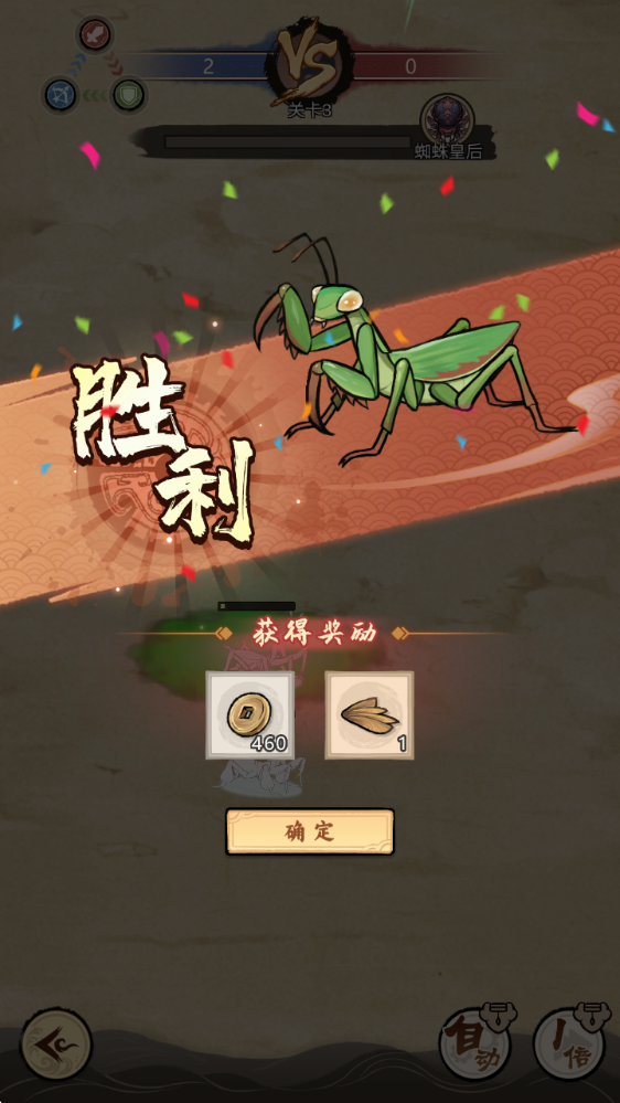 4、对战模式:采用三局两胜制的回合制战斗,玩家可派出三只螳螂分小轴、压轴、大轴上场,策略性搭配阵容以赢得全国总冠军为目标。