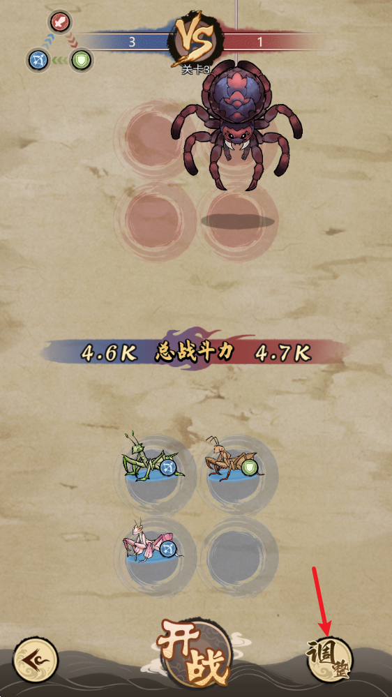 3、获得新的螳螂之后,我们前往关卡进行战斗,战斗前可以自由搭配自己的阵容。