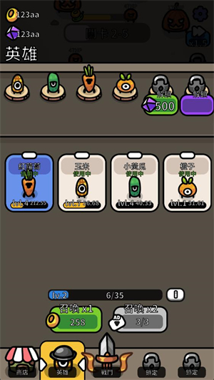 1、不同的水果蔬菜英雄等你去召唤来战斗,丰富的英雄角色可以自由选择来上阵战斗。
