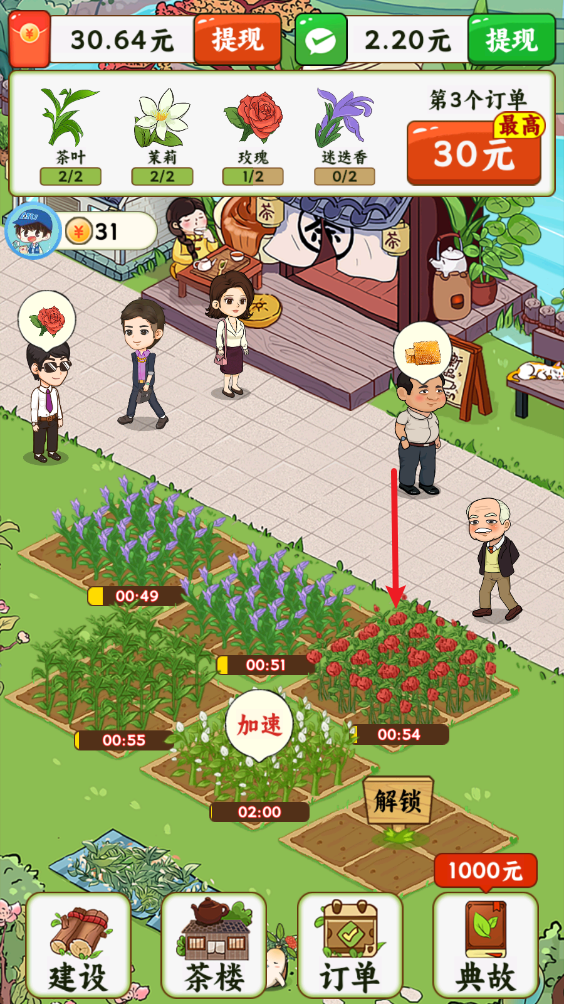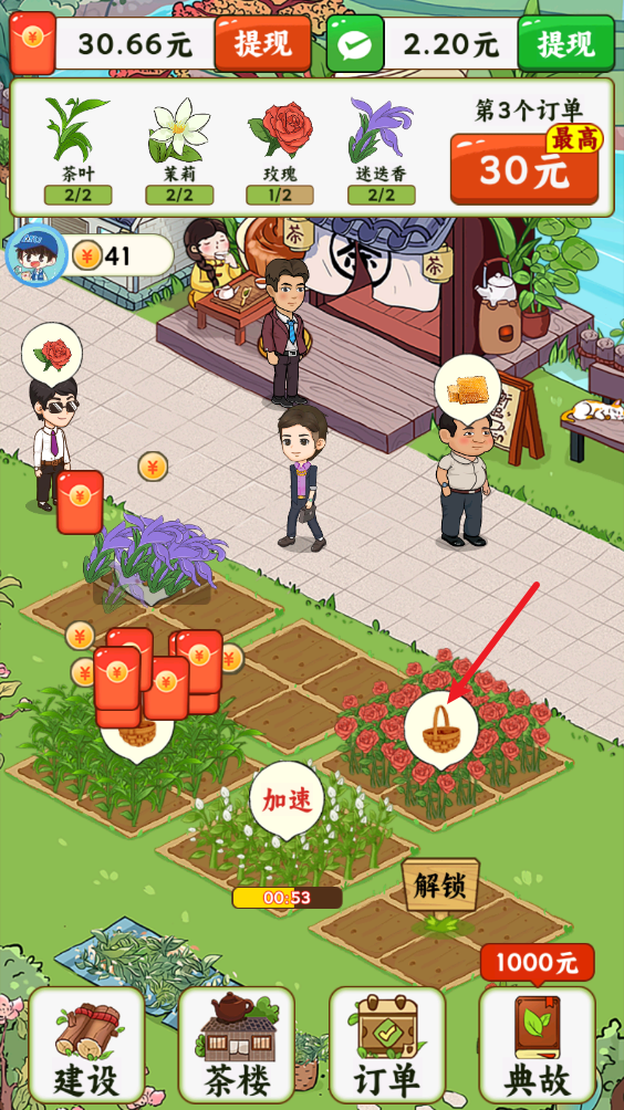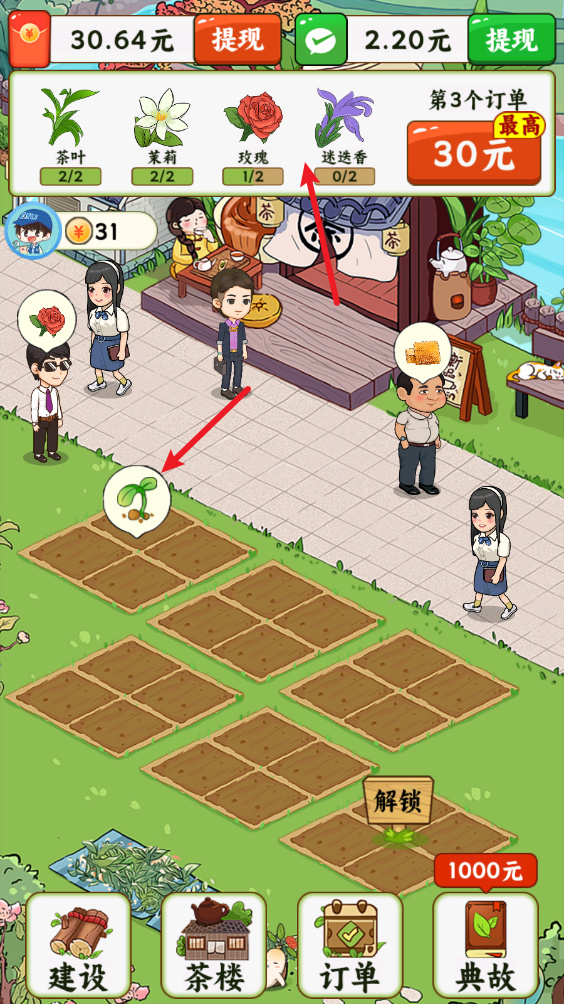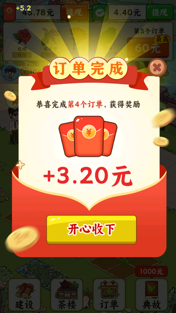 茶香满园,一款茶园经营玩法的休闲经营游戏,下载游戏,完成种植订单和看广告,最低0.3起T,亲测0.3R,秒入微信,以茶园为背景,画面精致,营造出茶香四溢的氛围,玩家能全方位感受经营茶园的乐趣与成就感。