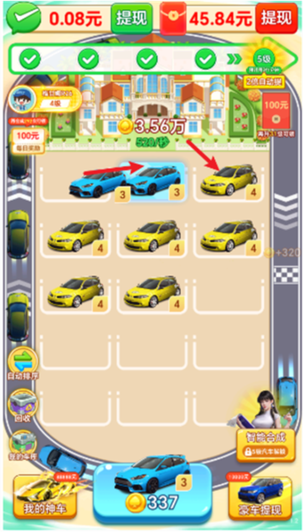 4、合成出的小车等级越高,能够获得的红包越丰厚。