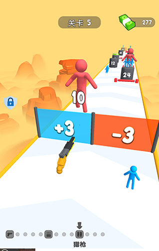 跑酷造型趣味化:摒弃传统跑酷角色造型,创新设计小人变身枪支的玩法,酷炫造型让跑酷过程不再单调,充满新鲜感;