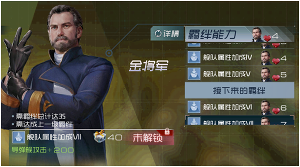 由于礼物不够不能解锁下面的羁绊,请各位看官自行脑补,里面5个进阶分别是军事演练1-4,军团物资1级,基本也就是军事演练里面各项奖励增加30%,军团各项奖励50%,解锁度要求高,建议礼物充足后再解锁。