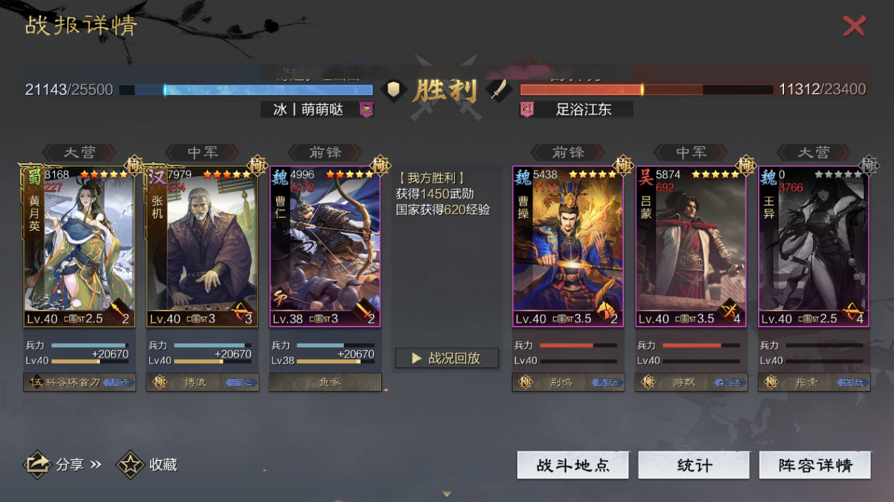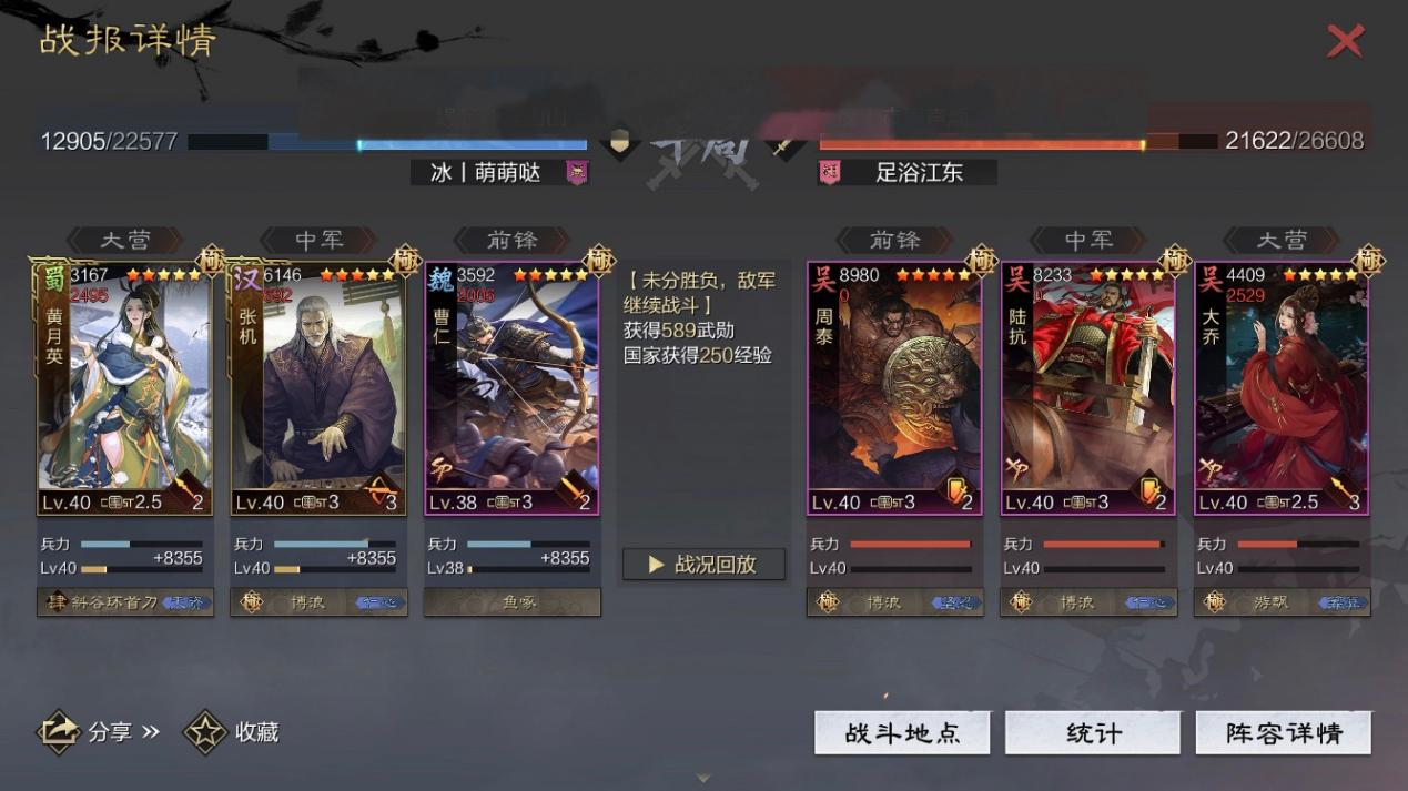 曾想过用贾诩替代月英,战法依旧是【三军】【重整】。由于战局吃紧,就没有更换。但想来,效果应该不差。贾诩代替月英,增加了爆头性,减少了普适性。