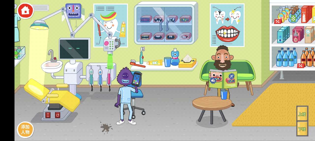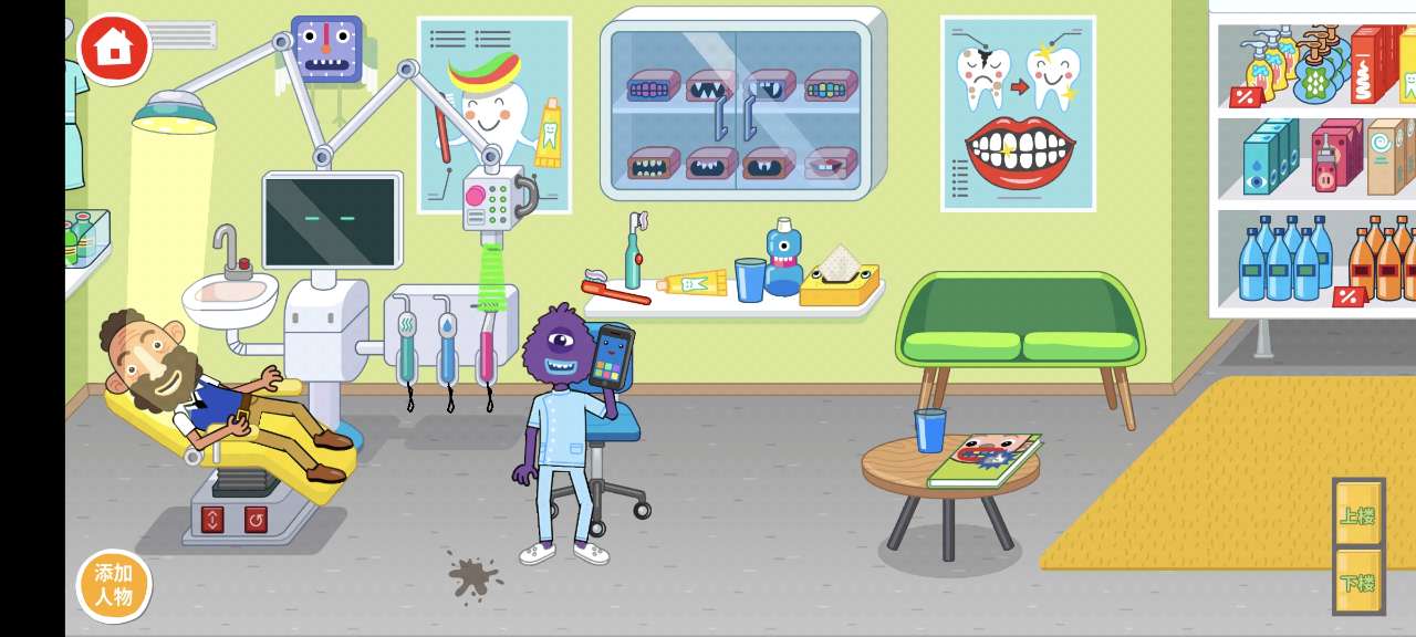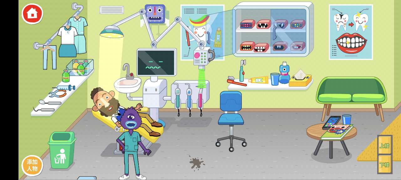4.对这个病人进行治病,可以从墙上看出这是牙科,所以病人需要看牙,你可以移动仪器来给他看牙。