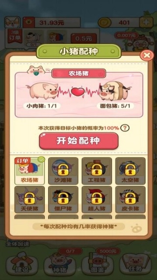 4.将不同造型的小猪交配后可以获取全新造型的小猪,不断饲养更多小猪不断获取更多奖励吧。