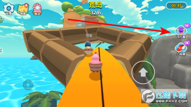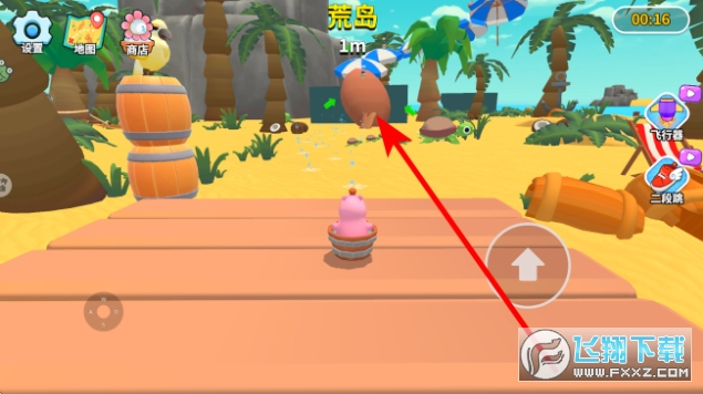 1、进入荒岛场景,通过左下角摇杆控制卡皮巴拉移动方向,驾驶木桶前行,靠近箭头指引目标,触发互动,推进探索进程。
