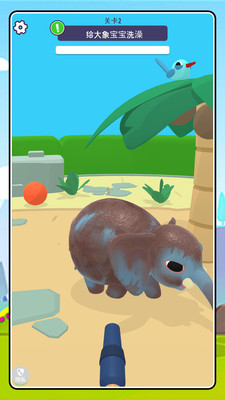 1:进入“给大象宝宝洗澡”关卡,操控下方工具(如喷头)清洁大象,完成洗澡任务。