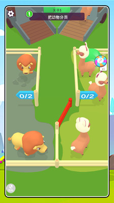 2:在“把动物分类”关卡,将对应动物(如狮子、羊驼)拖入同侧围栏,完成分类目标(各收集2只)。
