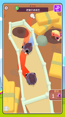 5:进入“把狸扔进泥巴”关卡,引导狸沿着路径移动,将其推进泥巴区域完成关卡。