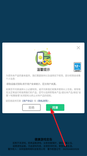 1、首先打开游戏,阅读并同意用户协议和隐私政策