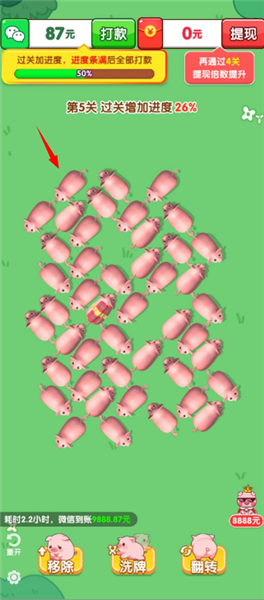 猪事大吉赚钱游戏以可爱的小猪为主角,玩家需要通过点击小猪,使其朝头部朝向移动,当前方无阻挡时小猪即可离场。当所有小猪都成功离场,玩家便能通关并获得红包奖励。随着游戏进程的深入,关卡难度逐渐提升,小猪数量增多、排列愈发复杂,为玩家带来更具挑战性的解谜体验。