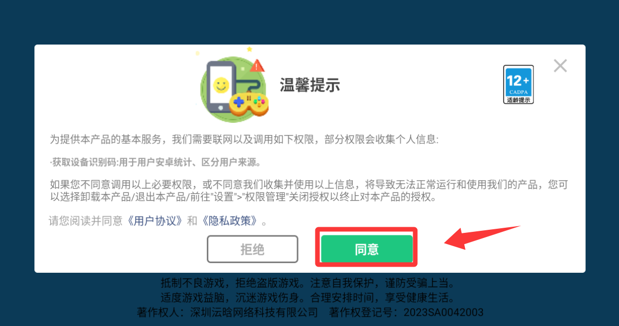 1、点击温馨提示里的同意并继续。