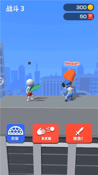 3、进入战斗之后,你可以选择向前进攻或者扔出你的武器攻击对手,在对手攻击你时,你可以进行防御;