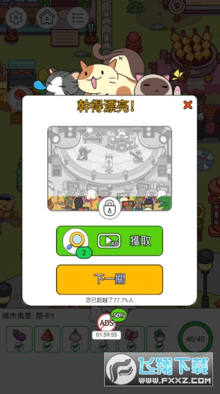 1、治愈系卡通世界:动态细节丰富的场景设计,搭配萌趣猫咪角色,营造温馨轻松的游戏氛围。