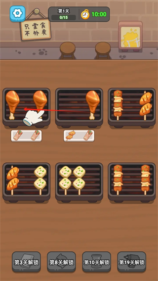 1、玩家扮演烧烤摊大掌柜,通过指尖轻点、拖动烤串,使三根相同的烤串碰在一起触发消除。
