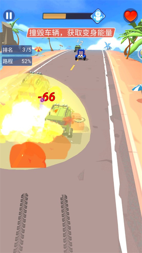 2、你需要撞毁其他车辆,争夺比赛的胜利,并获得变身能力;