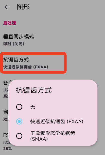 15、【抗锯齿方式】选择【快速近似抗锯齿(FXAA)】。