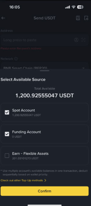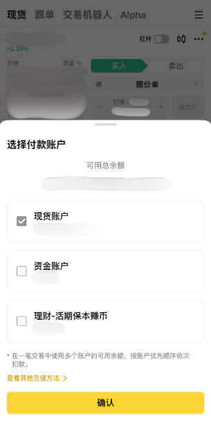 ***请注意,默认情况下,资金来源可能包括您的现货、资金和理财账户(如适用)。您还可以通过单击“可用”链接选择理想的账户作为您的资金来源。