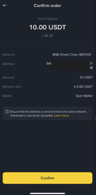 5. 此处将再次显示确认交易的提示。请仔细核对提现地址和网络,然后再点击【确认】。