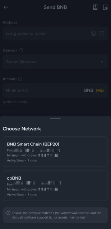 请谨慎选择网络,确保所选网络与提现平台的网络保持一致。如果选错网络,资金可能会丢失,无法找回。
