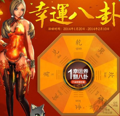 该活动可以通过使用幸运券来翻八卦牌,并获得八卦牌后面的奖品,而幸运值越高,翻出极品道具的概率越高,有几率直接抽到4人火炮兰掉落的双马尾发型。