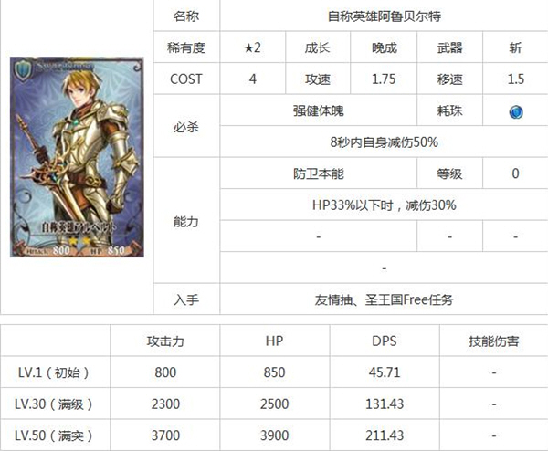 自称英雄阿鲁贝尔特,一张很有入手价值的2星肉盾骑士卡牌,主动技能与被动技能的双重减伤效果完美阐述了一个骑士应该具备的出色品质—硬,加上入手门槛并不会过高,还是非常建议大家入手的。