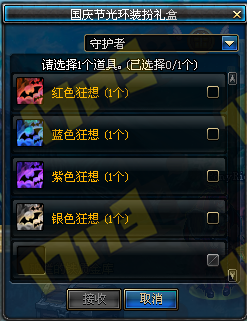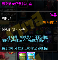 本次国庆节礼包光环装扮为账号绑定,打开后可以选择四个不同颜色属性的光环之一。