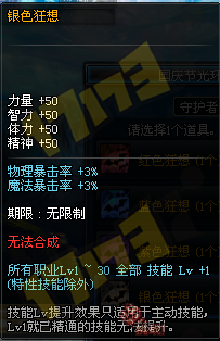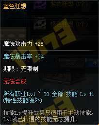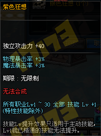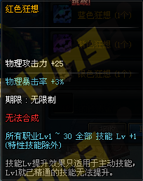 | 物理攻击力+25 物理暴击率+3% 1~30级技能+1 | 魔法攻击力+25 魔法暴击率+3% 1~30级技能+1 | 独立攻击力+40 物理暴击率+3% 魔法暴击率+3% 1~30级技能+1 | 力量+50 智力+50 体力+50 精神+50 物理暴击率+3% 魔法暴击率+3% 1~30级技能LV+1 |