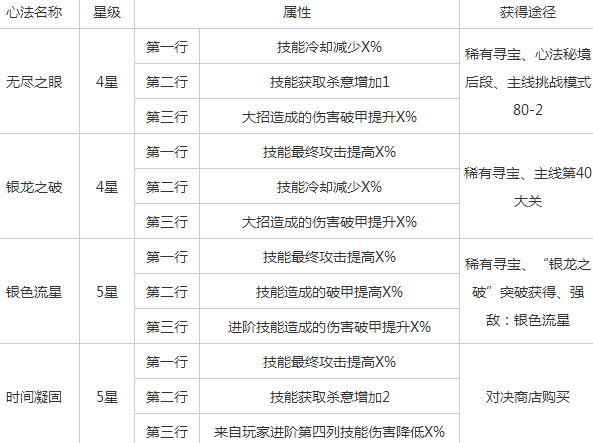在影之刃游戏中,心法不仅能够为角色增加基础的攻击和生命属性,还附带有额外其他3行属性,绿色和蓝色心法只有1行额外属性,心法突破到紫色有2个额外属性,心法突破到橙色和红色才有3行属性。每一列技能都对应4个心法,下面给大家详细介绍下所有心法的星级、属性和获得途径。