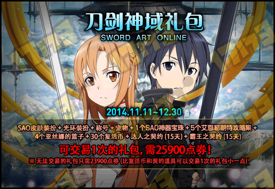 因为楼主体验服无限修复破损文件失败,所以只能从小伙伴和贴吧拿图片,所以大小以及内容不是很全面,等能上了之后会更正。 本次更新的话两个,光棍节活动+SAO礼包。 首先是SAO 两种价格。 ...