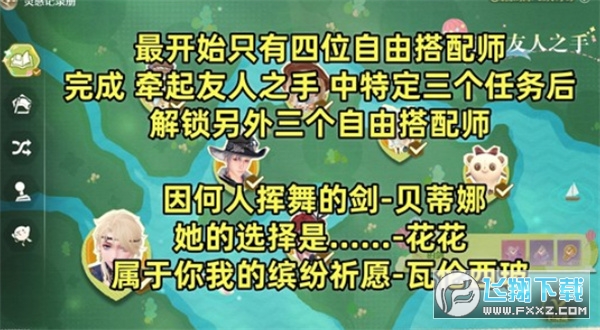初始阶段,地图上会出现四位自由搭配师。玩家需要逐一与他们对话完成游说,成功后可获得钻石奖励。其余三位搭配师需要通过完成“牵起友人之手”系列任务解锁。