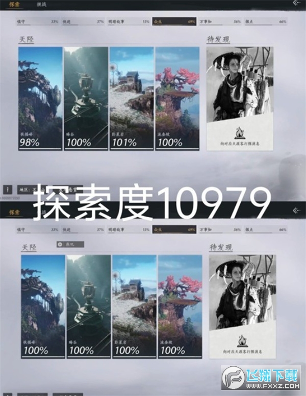 区域1除墨城和碧水云涛各卡了一个旧物回溯(99%)外均可100%。