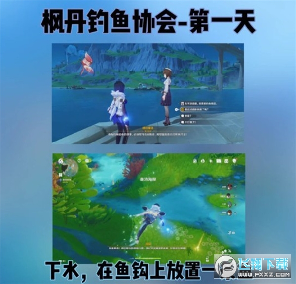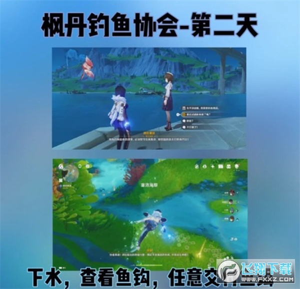 1、前往枫丹东侧钓鱼点(建议开启水下锚点,游上去更快)