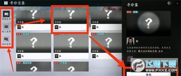 1、在【奇珍宝鉴】界面追踪鹳长老及其他游侠发布的「寻珍鉴」