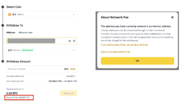 只有当收款人地址是币安账户时,才能免除手续费且确保资金即时到账。确认通过提现进行站内转账之前,请确保目标地址属于币安账户。