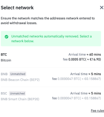 币费率因所选网络不同而不同。 换言之,所需的提现数量和手续费将根据您所选的区块网络而变化。在此示例中,我们有BEP20 BNB Smart Chain (BSC)(原币安智能链 Binance Smart Chain),BEP2 BNB Beacon Chain(原币安链 Binance Chain)(币安链)和ERC20(以太坊)三种选择。