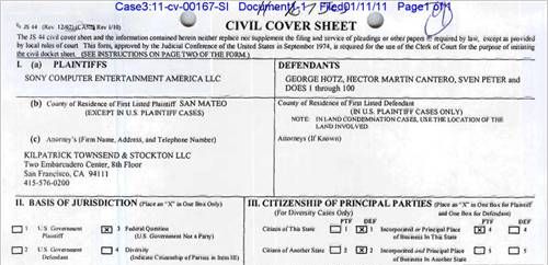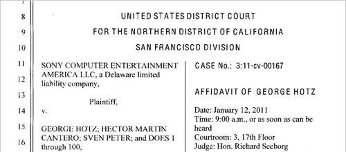 索尼一度拿出了280页的文件“证据”,这些文件中包括从Twitter、各大论坛、新闻报道页面的PS3破解相关页面截图。并且声明这些黑客是行为是侵犯自己版权,促进盗版,以及损害PSN网络商店的使用者授权条款,并且提出了要求Geohot等黑客不得继续从事相关破解以及损失赔偿的条件。