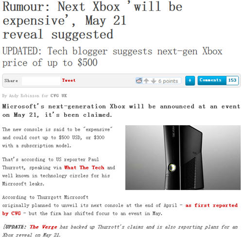 您的位置:首页 → 游戏新闻资讯 → 业界动态 → XBOX720主机5月21日正式公布 裸机售价500美元