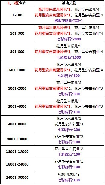 在活动期间,每个区将根据全部亚瑟所拥有的“龙鳞”数量进行排名,7星花月型米诺儿、5星花月型安吉莉亚、极限突破切尔莉、七彩辉石等丰富奖励等您抢!花月型米诺儿、花月型安吉莉亚在7月17日15:00-8月1日15:00期间攻击力可提升至2-3倍!
