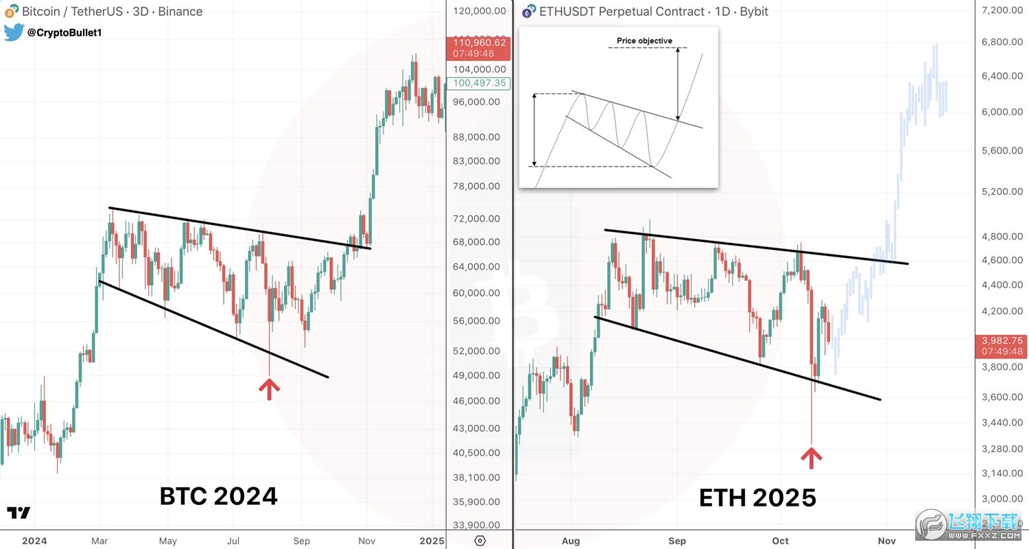 与此同时,市场分析师"Crypto Bullet"将2024年比特币的图表模式与2025年以太坊进行比较,表示它们是"完全相同的模式",然后预测以太坊今年将上涨至6000美元至7000美元。