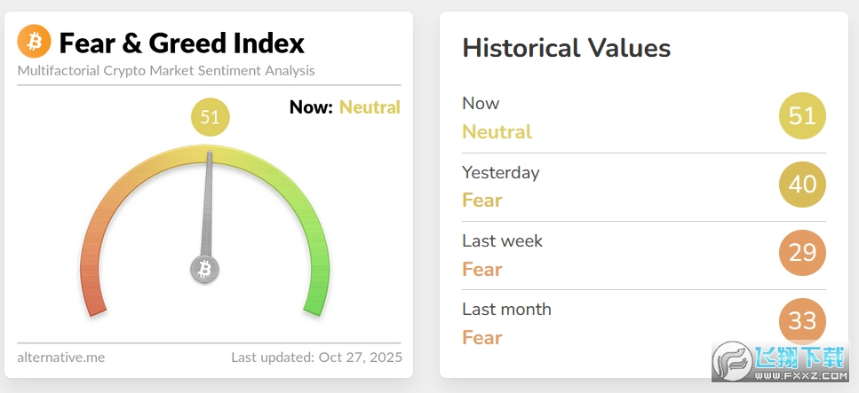 加密货币恐慌与贪婪指数终于在周日爬出了"恐慌"区域,两周多来首次回到中性,此时比特币价格在周末重新飙升至约11.5万美元。
